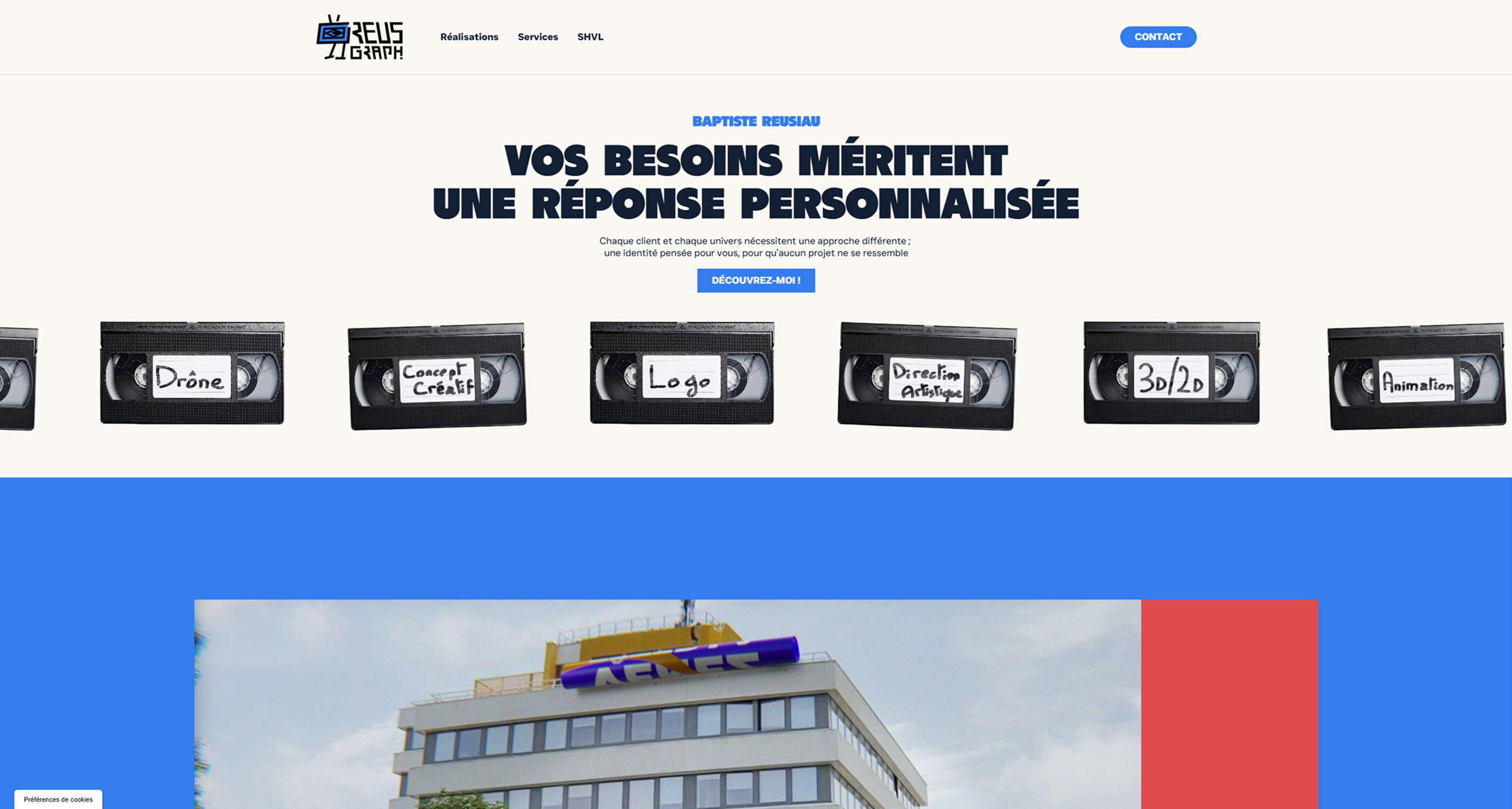 Site vitrine pour Reus-Graph, graphiste freelance basé en Normandie. Le brief était clair : un site qui laisse la place aux créations sans parasiter le regard. On est partis sur une structure épurée, une navigation intuitive et une galerie qui se suffit à elle-même.